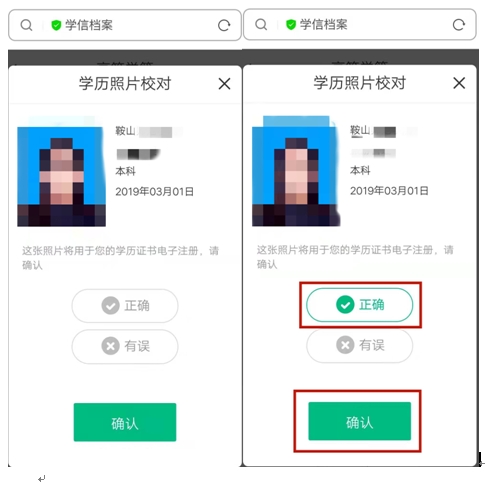 確認(rèn)無(wú)誤后,點(diǎn)擊 學(xué)歷照片還未校對(duì)。