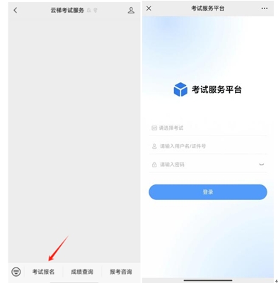 2、點(diǎn)擊考試報(bào)名,選擇對(duì)應(yīng)考試登錄賬號(hào)